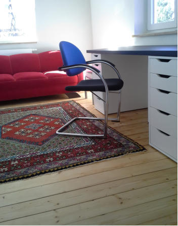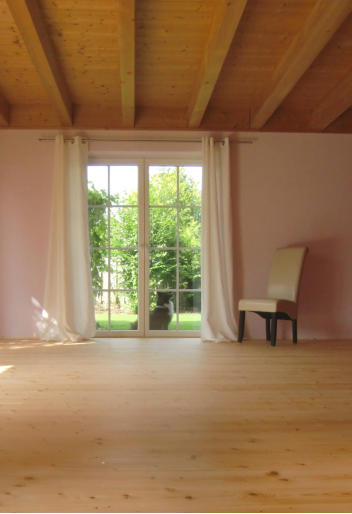 Beispiel eines Raumes nach der Renovierung. Der außergewöhnliche Dielenboden aus „Red-Pitch-Pine“