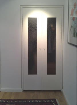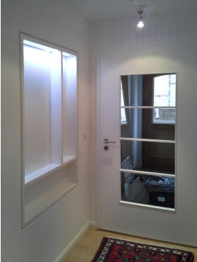 Einbaumöbel im Eingangsbereich. Beleuchtete Vitrine und Garderobenschrank. Die schlichte Gestaltung der weiß