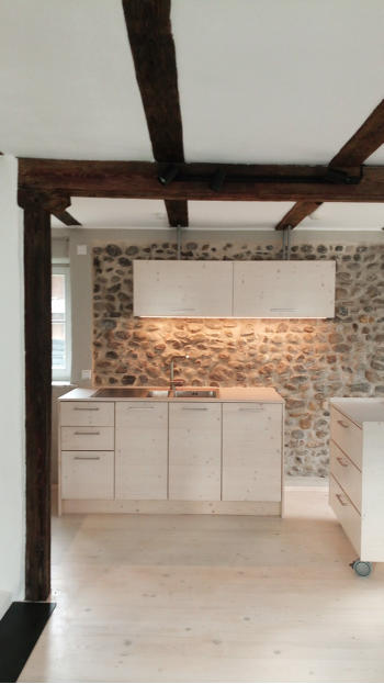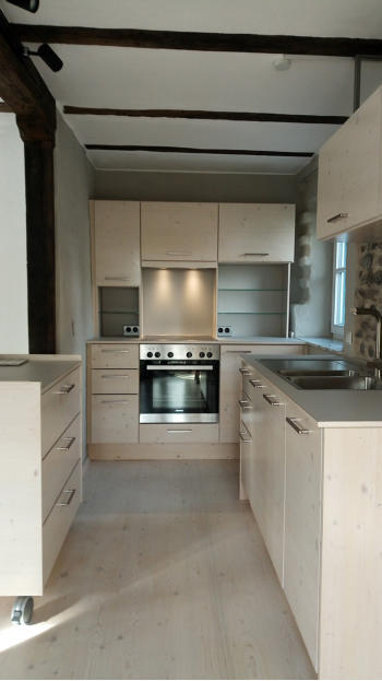 Klassisches Handwerk sowie die schlichte, moderne Formensprache dieser Küche integrieren sich in das Interior-Konzept. Vom Rohbau des entkernten historischen Hauses entstand die Planung der Innenarchitektur und die Ausführung des Möbelbaus aus einer Hand. Für die solide Schreinerarbeit wurden weitgehend Vollholz und umweltfreundliche Oberflächenbeschichtungen verwendet