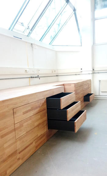 Für befreundete Designer entstand dieses Einbaumöbel für das entworfene Konzept der Innenarchitektur. Platziert in einem Coworking-Space, wird es später mit Kissen und Sitzpolstern belegt und als „Chillout-Arbeitsbereich” genutzt.