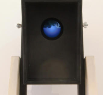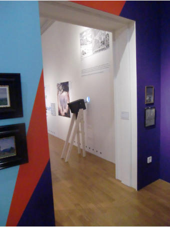 Ein Loch in der Ausstellungswand gibt den Blick durch das Fenster frei. Durch die „Camera Obscura“