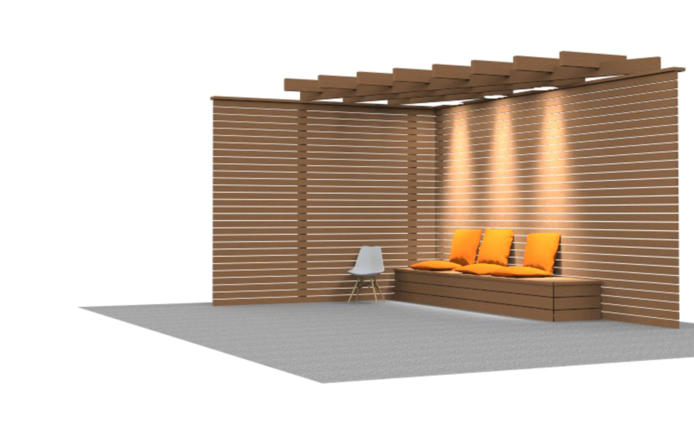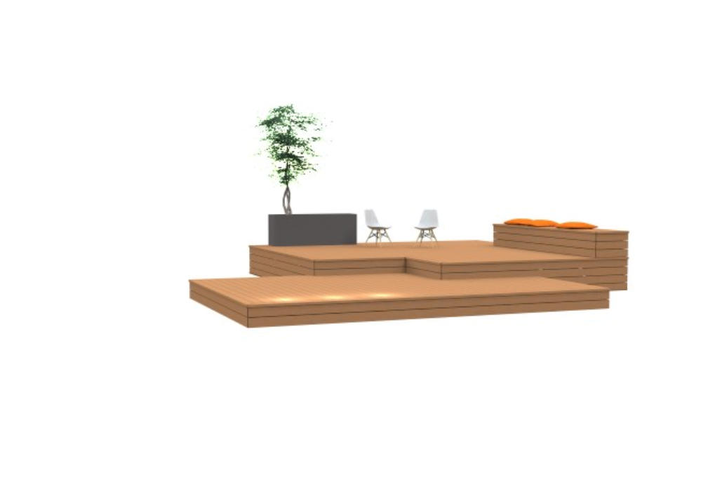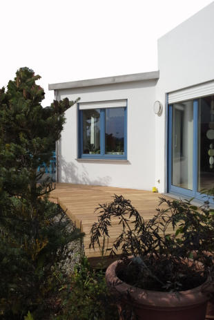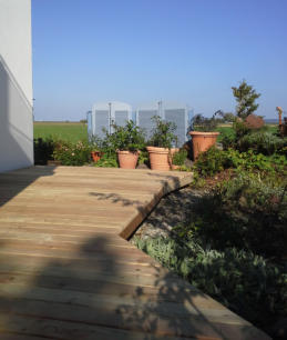 Die folgende Terrasse entstand für einen Landschaftsarchitekten. Auf der Südseite des Hauses platziert, wurde Sie zu Atrium des Bungalows. Sie unterstreicht die mediterrane Erscheinung des Hauses. Der Bauherr mit viel Sinn für Details, wünschte sich einen edlen und zugleich natürlichen Terrassenbelag. Seinem ökologisch orientiertem Sinn folgend, wählte er Wallaba-Stauseeholz. Dies ist eine umweltfreundlichere Alternative zu anderen Tropenhölzern.