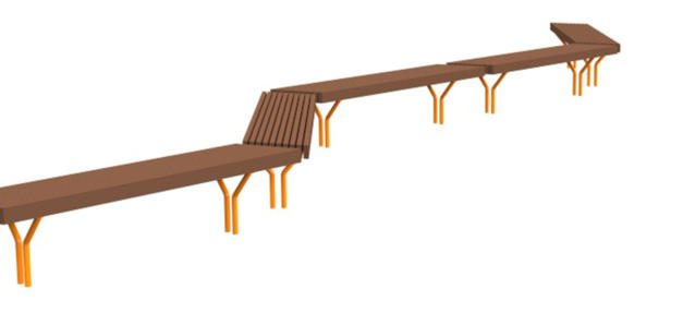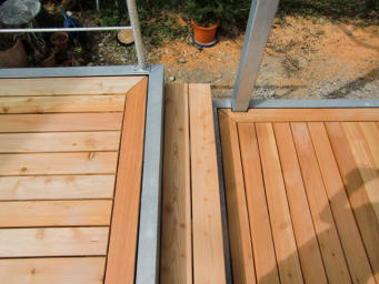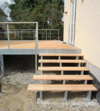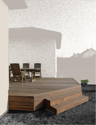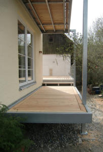 Die Stahlkonstruktion bildet das Grundgerüst für den Lärchenholzbelag. Dieser wurde unsichtbar verschraubt. Dadurch wurde ein besonders ruhiges Erscheinungsbild des Terrassenbelags erzielt.
